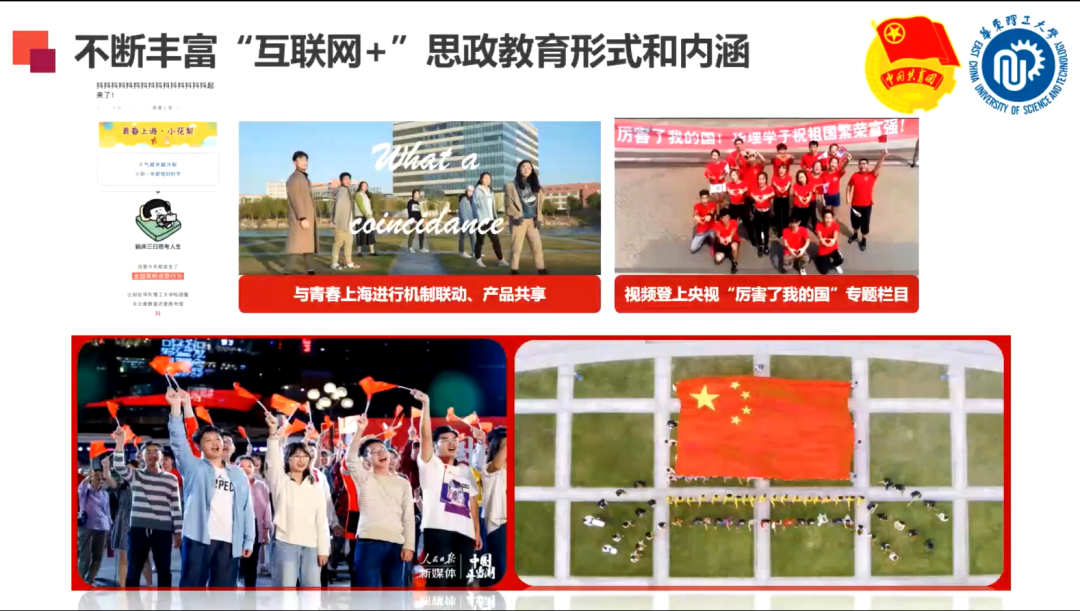 5月17日晚,2020年度“上海市基層團(tuán)組織典型選樹”專項工作團(tuán)(工)委第7組互訪互學(xué)線上活動順利舉辦。本次活動以“共青團(tuán)新媒體建設(shè)研討交流”為主題,由華東理工大學(xué)化工學(xué)院團(tuán)委組織開展,復(fù)旦大學(xué)、東華大學(xué)、上海財經(jīng)大學(xué)、上海理工大學(xué)、華東政法大學(xué)、上海電力大學(xué)、上海農(nóng)林職業(yè)技術(shù)學(xué)院、同濟(jì)大學(xué)、上海大學(xué)、上海交通大學(xué)等10所滬上高校學(xué)院團(tuán)委書記、副書記以及團(tuán)學(xué)骨干線上參會。華東理工大學(xué)團(tuán)委副書記魏星、化工學(xué)院黨委副書記高藝霞、“小花梨”新媒體工作室學(xué)生負(fù)責(zé)人李承霖,記者團(tuán)副團(tuán)長蘇孟帥參與活動。活動由化工學(xué)院團(tuán)委書記強莉主持。