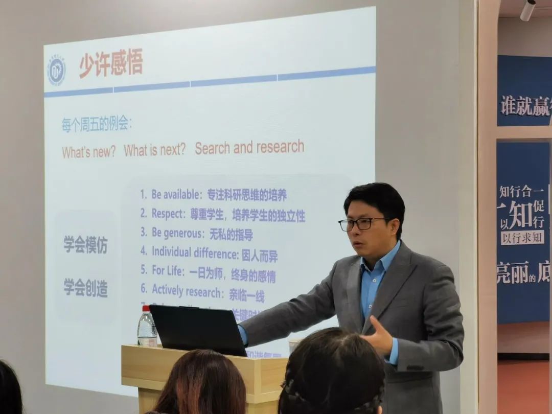 龍東輝教授對(duì)“科研Research”的內(nèi)涵進(jìn)行了深入的闡述,讓同學(xué)們?cè)谶~入科研的大門之前找準(zhǔn)方向,激勵(lì)同學(xué)們:科研要學(xué)會(huì)模仿,學(xué)會(huì)創(chuàng)造!科研要善于思考,善于鉆研!科研要敢于執(zhí)行,敢于批評(píng)!作為一名資深導(dǎo)師,龍教授認(rèn)為教師應(yīng)該牢記“學(xué)高為師,身正為范”的責(zé)任和擔(dān)當(dāng),學(xué)生也應(yīng)當(dāng)對(duì)科研生活充滿熱情和動(dòng)力,積極向上的研究氛圍、教師與學(xué)生教學(xué)相長(zhǎng),才是科研正確的打開方式。
