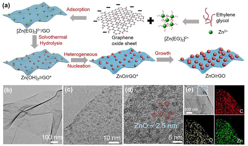 基于此,該研究提出了一種簡便通用的“界面誘導(dǎo)成核”的合成策略,利用氧化石墨烯表面上的含氧官能團(tuán)作為快速異相成核的位點(diǎn),通過表面擴(kuò)散控制顆粒成長,進(jìn)而在二維表面上形成3nm尺寸、單分散和高密度負(fù)載的系列金屬氧化物(ZnO、CoO、CuO、MgO、Fe2O3、Nb2O5、CdO、 La2O3、MoO3等)納米顆粒。統(tǒng)計(jì)發(fā)現(xiàn),超細(xì)納米顆粒的面密度均為9個(gè)/10×10nm2,且不隨反應(yīng)時(shí)間和反應(yīng)物濃度而改變,對應(yīng)于“異相成核-擴(kuò)散控制生長”的顆粒形成機(jī)制。進(jìn)一步的DFT計(jì)算表明,氧化石墨烯表面的含氧官能團(tuán),特別是羧基和環(huán)氧基,能夠優(yōu)先吸附金屬離子,并提供成核位點(diǎn),進(jìn)而對納米顆粒的形成和均勻生長起著重要作用。