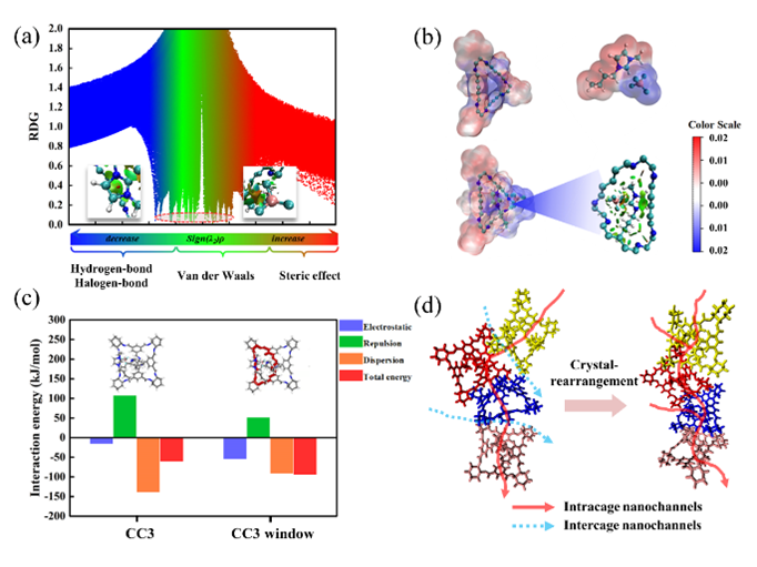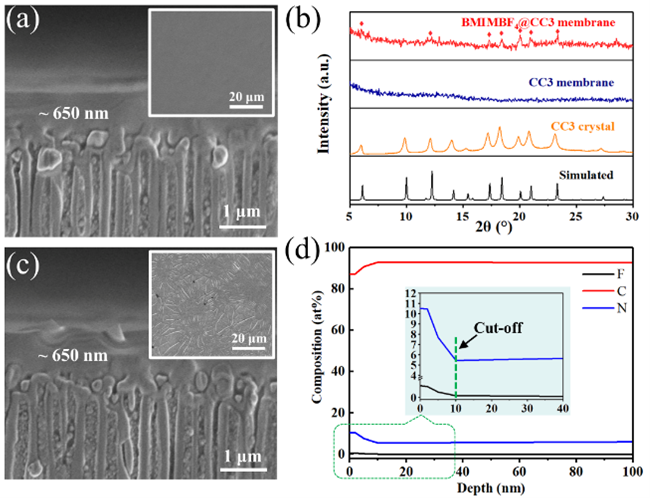 密度泛函理論(DFT)表明POC和離子液體分子之間的相互作用以范德華力和少量氫鍵主導(dǎo)。POC分子的孔口顯示靜電負性,可以與離子液體分子的靜電正部分結(jié)合。在膜表層誘導(dǎo)重排過程中,基于靜電吸引效應(yīng),離子液體分子誘導(dǎo)靜電負性POC窗口優(yōu)先向外排列,與離子液體分子中的正電部分結(jié)合,使POC重排成緊密且規(guī)則有序的晶體薄層,消除了晶間間隙。