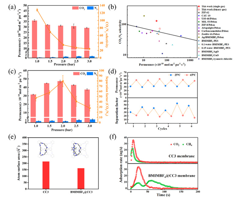 氣體分離性能測試表明晶體重排顯著提高了POC膜的氣體分離選擇性。膜性能超過了目前已報道的大多數(shù)分離膜,且POC膜表現(xiàn)出較好的長期和熱沖擊穩(wěn)定性。進一步的表征和計算表明離子液體分子誘導(dǎo)表面晶體重排后修飾POC本征孔道,實現(xiàn)了POC本征孔的原位調(diào)控,阻止了N2等較大分子的進入,并通過石英晶體微天平測試驗證了這一結(jié)論。該工作為制備具有規(guī)則通道的晶體重排膜提供了新的啟發(fā)。