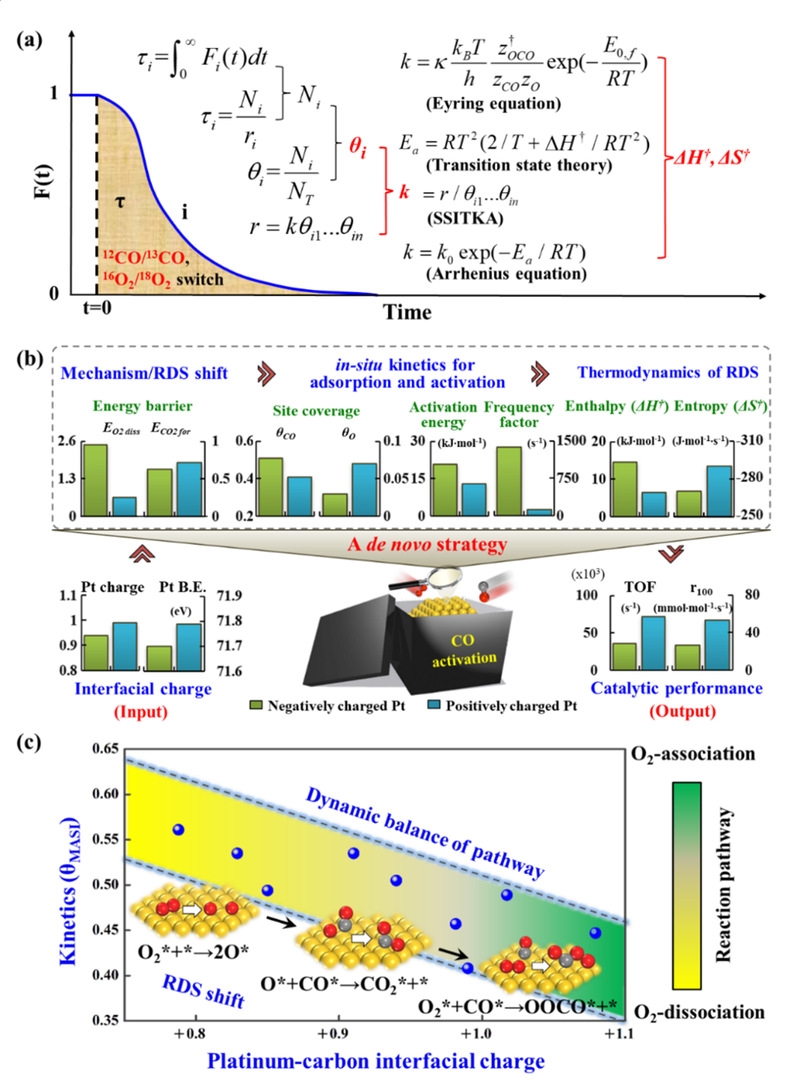 論文一方面創(chuàng)新發(fā)展了催化反應(yīng)速率解析的方法,采用原位光譜/動(dòng)力學(xué)分析與多尺度模擬相結(jié)合的研究手段,實(shí)現(xiàn)基于動(dòng)力學(xué)分析的催化劑活性位與催化描述符辨認(rèn)。另一方面,提出了“自下而上”的電子效應(yīng)研究策略(圖2),定量關(guān)聯(lián)了“金屬-載體表界面相互作用-反應(yīng)機(jī)理-速率決速步的動(dòng)力學(xué)與熱力學(xué)信息-催化性能”之間的關(guān)系,從分子層面闡明了金屬-載體間的電子相互作用根源及其對(duì)催化動(dòng)力學(xué)行為及反應(yīng)機(jī)理的調(diào)控機(jī)制,實(shí)現(xiàn)了高活性和選擇性的催化劑設(shè)計(jì)開發(fā)。