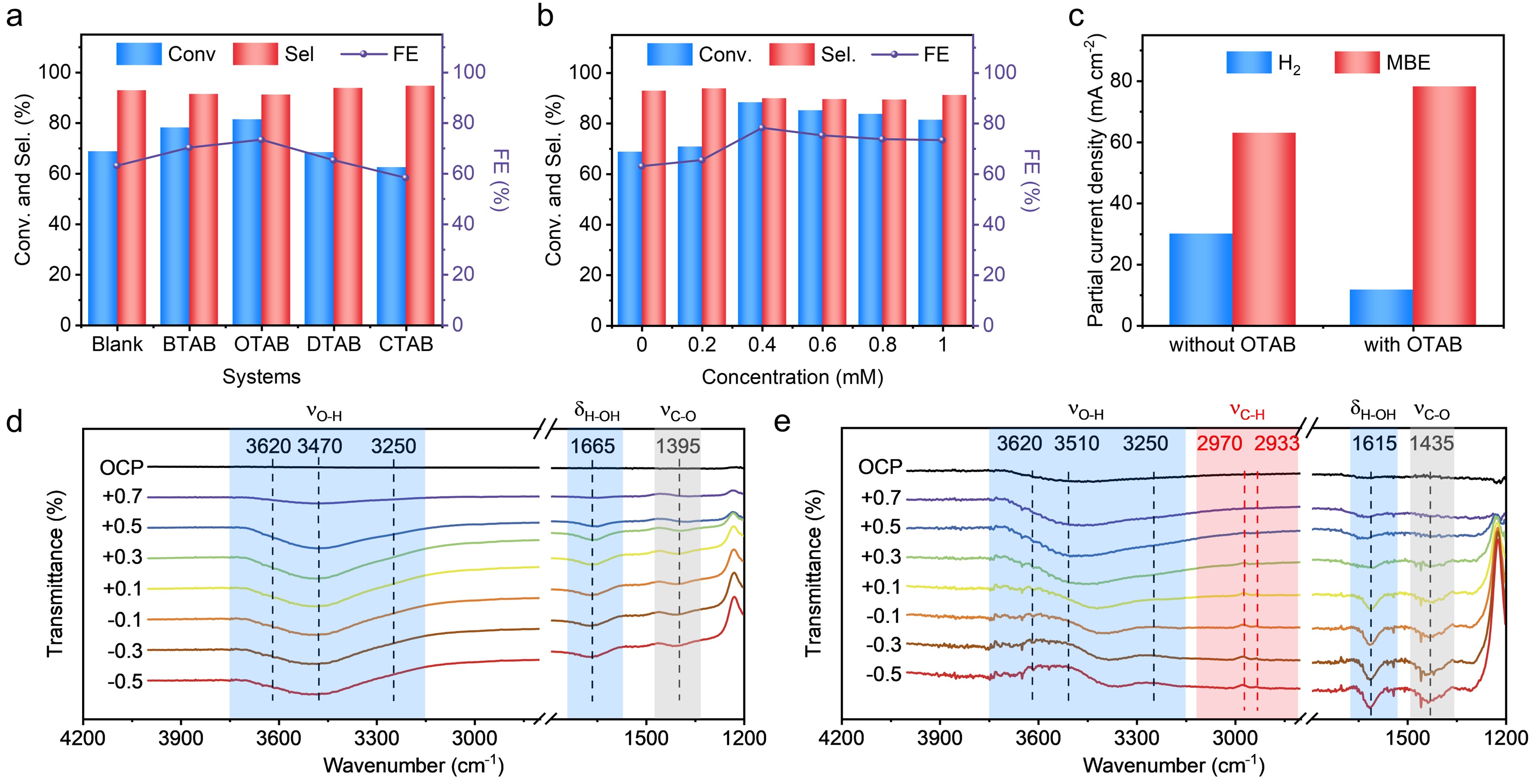 在電催化炔醇半加氫反應中,該工作創(chuàng)新性地構建了一個摻雜劑以及表面活性劑共調(diào)節(jié)的電極-電解液界面,通過性能研究、原位紅外光譜表征以及理論計算相結合的方法,闡明了炔醇電催化加氫過程中高活性和法拉第效率的來源。通過以硼摻雜的鈀基催化劑作為模型催化劑,探究不同鏈長的季銨鹽表面活性劑對于界面水的傳質以及炔醇加氫反應的影響。性能研究表明,加入合適鏈長以及合適濃度的表面活性劑可以實現(xiàn)最大化的烯醇法拉第效率。原位光譜證明,隨著電壓負移,界面水的反向吸附峰表明孤立水的顯著損失,而彎曲水的峰偏移表明發(fā)生了從強氫鍵水到弱氫鍵水的轉變。在含有表面活性劑的界面上形成適當?shù)氖杷h(huán)境,可以在一定程度上阻礙界面水的傳質,從而抑制HER。分子動力學結果表明,通過陽離子表面活性劑在界面上的自組裝,建立了一個促進炔醇傳質,并適當?shù)刈璧K水傳質的界面微環(huán)境。因此,在不降低烯醇選擇性的情況下,明顯促進了炔醇半氫化到烯醇的法拉第效率。該工作對于反應過程和反應機制的認識可以進一步延伸到其他有機物的電催化加氫反應中。