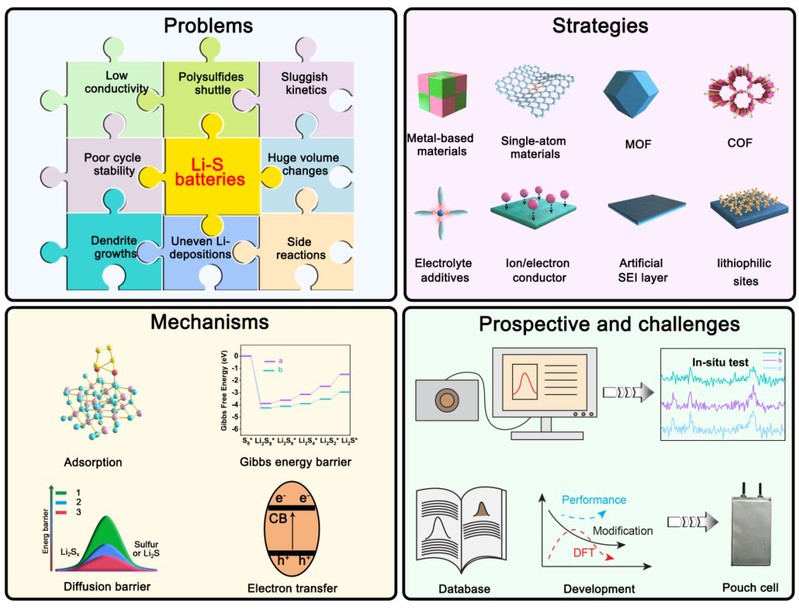 圖片說明:鋰硫電池面臨的問題、策略、機(jī)制、前景和挑戰(zhàn)