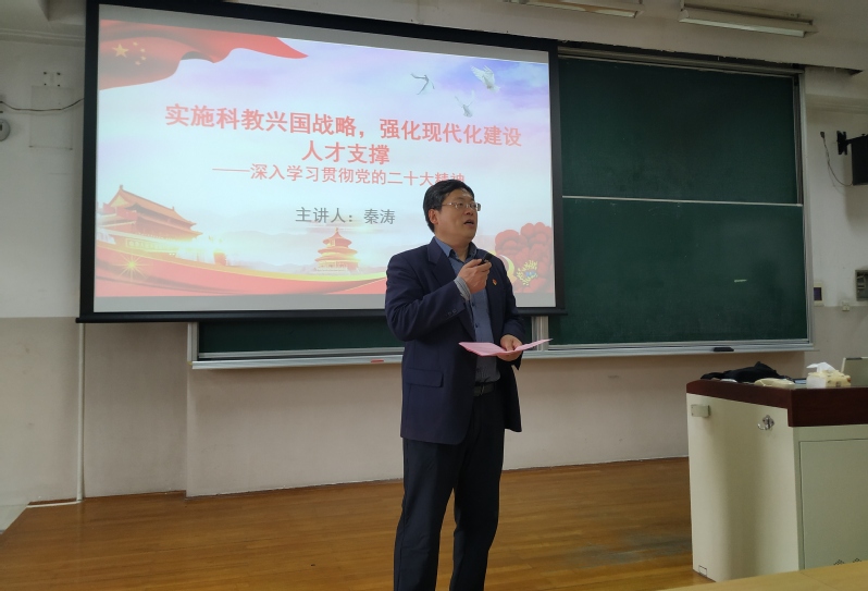 秦濤以“實施科教興國戰(zhàn)略,強化現(xiàn)代化建設人才支撐——深入學習貫徹黨的二十大精神”為題,從黨的二十大主題講起,圍繞我國發(fā)展面臨的問題、應對問題的總方略、完善科技創(chuàng)新體系、加快實施創(chuàng)新驅(qū)動發(fā)展戰(zhàn)略、深入實施人才強國戰(zhàn)略、辦好人民滿意的教育等方面,對黨的二十大報告中的“科教興國戰(zhàn)略”進行了全面系統(tǒng)的闡述。報告中豐富的案例和詳實的數(shù)據(jù),讓學院教師對黨的二十大精神有了更全面、更深刻的理解和認識。