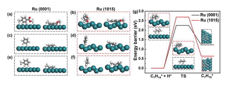 同位素示蹤實(shí)驗(yàn)和密度泛函理論計(jì)算結(jié)果表明,PET氫解中間物種在低配位位點(diǎn)釕上更傾向于“直立”吸附,而在高配位位點(diǎn)釕上更傾向于“平躺”吸附。其中,“直立”吸附構(gòu)型能夠抑制苯環(huán)加氫及開環(huán)副反應(yīng),進(jìn)而促進(jìn)三苯生成。