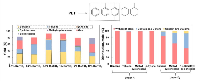 研究團(tuán)隊(duì)以TiO2為載體,通過改變活性金屬釕的負(fù)載量制備了具有不同釕配位環(huán)境的Ru/TiO2催化劑。球差電鏡和X射線吸收精細(xì)結(jié)構(gòu)譜分析結(jié)果表明,制得的系列釕基催化劑中10%Ru/TiO2以高配位釕位點(diǎn)為主,而0.5%Ru/TiO2以低配位位點(diǎn)為主,前者平臺(tái)位點(diǎn)居多,后者臺(tái)階位點(diǎn)和角位點(diǎn)居多。催化性能測(cè)試結(jié)果表明,釕配位環(huán)境顯著影響了PET氫解制三苯的收率,平均配位數(shù)為~5.0的0.5%Ru/TiO2上能夠獲得較高的BTX收率(77%),而高配位數(shù)的Ru/TiO2上氫解過程會(huì)形成更多的氣體和加氫飽和產(chǎn)物。