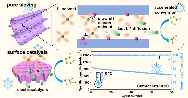 對(duì)此,功能炭材料研究團(tuán)隊(duì)提出了一種孔徑篩分效應(yīng)與電催化結(jié)合的策略,設(shè)計(jì)了表面分散CoP、氮摻雜的“貫穿孔”結(jié)構(gòu)二維多孔碳納米片,使其在Li+擴(kuò)散過程中發(fā)揮離子助推器的作用。其中,貫穿孔結(jié)構(gòu),有利于提高溶劑化Li+的去溶劑化程度,進(jìn)而提高Li+的擴(kuò)散速率;CoP提供的活性位點(diǎn),可提高溶劑化Li+的去溶劑化速率,并對(duì)多硫化鋰發(fā)揮化學(xué)吸附和催化轉(zhuǎn)化的功能。當(dāng)該材料用作商用聚丙烯隔膜的涂層材料時(shí),炭黑/硫正極展現(xiàn)出優(yōu)異的電化學(xué)性能:大電流倍率性能(3C,775 mAh g?1)、循環(huán)穩(wěn)定性(2C,800次,容量衰減率僅為0.048%)、高硫利用率(0.1C,80次,3.2 mAh cm?2)和低溫耐受性(0oC,0.1C,80次, 647 mAh g?1)。此外,采用密度泛函理論、原位Raman、飛行時(shí)間二次離子質(zhì)譜等分析表征手段,揭示了貫穿孔結(jié)構(gòu)、CoP化學(xué)位點(diǎn)等對(duì)可溶性多硫化鋰的物理阻擋-化學(xué)吸附-催化轉(zhuǎn)化耦合強(qiáng)化機(jī)制。該研究對(duì)促進(jìn)鋰硫電池的商業(yè)化進(jìn)程具有重要意義。