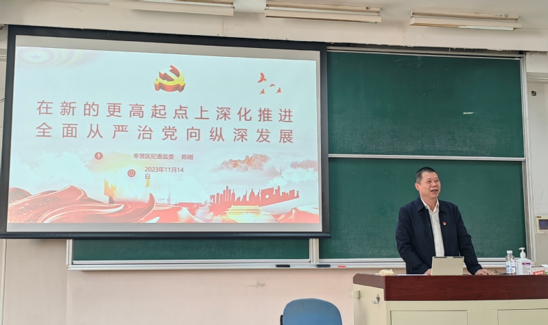為深入學(xué)習(xí)貫徹習(xí)近平新時(shí)代中國(guó)特色社會(huì)主義思想和黨的二十大精神,持續(xù)推進(jìn)學(xué)院全面從嚴(yán)治黨工作,11月14日,化工學(xué)院邀請(qǐng)奉賢區(qū)紀(jì)委常委、區(qū)紀(jì)委監(jiān)委組織部部長(zhǎng)陳剛為學(xué)院師生作廉潔教育專(zhuān)題報(bào)告,學(xué)院黨政領(lǐng)導(dǎo)班子成員、全體教工、學(xué)生黨支部紀(jì)檢委員參加學(xué)習(xí)。報(bào)告由學(xué)院黨委副書(shū)記兼紀(jì)委書(shū)記段學(xué)志主持。
