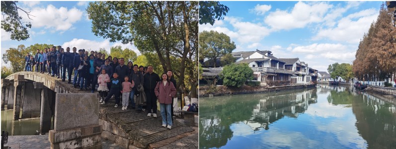 秋景引閑步,山游不知疲。午后,老師們來到素有“江南第一橋鄉(xiāng)”美譽(yù)的金澤古鎮(zhèn)。一路經(jīng)過普慶橋、普濟(jì)橋、如意橋、金澤放生橋,一座座古橋分別橫架在市河及其支流上,仿佛來到了那個(gè)“出門即過橋,人家盡枕河”的人間江南。沿著青石板,最后停步在了迎祥橋。迎祥橋在元、明時(shí)代是古鎮(zhèn)經(jīng)濟(jì)繁榮的中心,各路農(nóng)產(chǎn)品和經(jīng)濟(jì)作物均在迎祥橋兩岸集散,人來人往,川流不息。