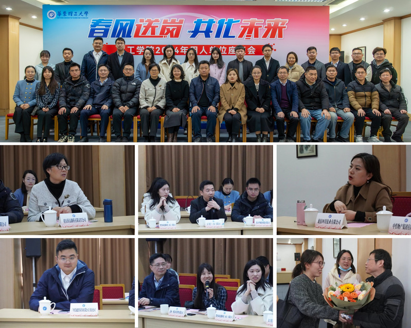 招聘會前,學院召開了用人單位座談會,高藝霞、徐至、相關系所主任與企業(yè)代表深入交流。企業(yè)代表對學院人才培養(yǎng)質量給予了充分肯定,并結合單位用人情況、圍繞高質量人才培養(yǎng)暢所欲言、獻計獻策,對華理優(yōu)秀學子求賢若渴。座談會后還出現(xiàn)了不期而遇的溫馨場面,作為企業(yè)代表的兩位校友專程為自己在校時的老師送上了鮮花,表達了對母校老師最真摯的祝福。