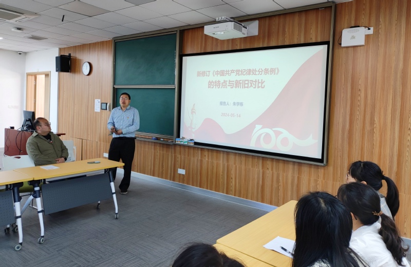 朱學(xué)棟以“新修訂《中國共產(chǎn)黨紀(jì)律處分條例》的特點(diǎn)與新舊對比”為題講授紀(jì)律黨課。他從新修訂《條例》的背景與意義講起,著重闡述了新修訂《條例》的主要特點(diǎn)、新舊《條例》內(nèi)容對比和新《條例》的亮點(diǎn),并指出了新《條例》對黨員領(lǐng)導(dǎo)干部和基層黨組織建設(shè)的影響,以及對黨風(fēng)廉政建設(shè)和反腐敗斗爭、對全面從嚴(yán)治黨的重要推動(dòng)作用。他強(qiáng)調(diào),全體黨員要把學(xué)習(xí)貫徹《條例》作為重要政治任務(wù),把《條例》學(xué)深學(xué)透,使廉潔自律規(guī)范內(nèi)化于心、外化于行,守住紀(jì)律“底線”、不越“紅線”,切實(shí)以學(xué)紀(jì)、知紀(jì)、明紀(jì)、守紀(jì)的優(yōu)良紀(jì)律作風(fēng)保障學(xué)院事業(yè)高質(zhì)量發(fā)展。