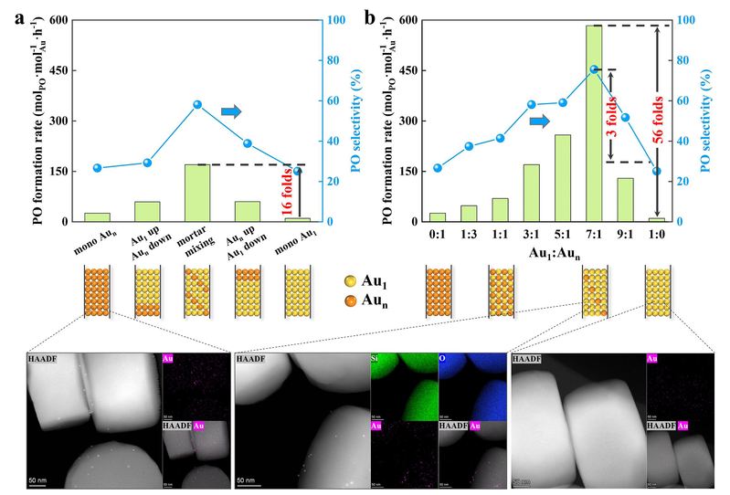 圖片說明:Au SACs與Au NPs間的接力催化大幅提升丙烯環(huán)氧化反應(yīng)性能