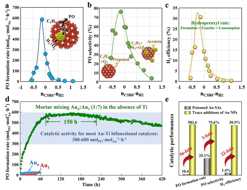 進一步通過調(diào)控Au SACs和Au NPs的空間距離與床層分布,實現(xiàn)了反應(yīng)物覆蓋度的匹配,從而實現(xiàn)了過氧化氫自由基的形成、轉(zhuǎn)移和消耗的速率匹配。實驗證明,僅需添加占Au SACs質(zhì)量0.3%的微量Au NPs解毒劑,即可顯著提升環(huán)氧丙烷的生成速率(56倍)、選擇性(3倍)和H2效率(22倍),并且這種優(yōu)異性能能夠持續(xù)穩(wěn)定150小時以上。這一發(fā)現(xiàn)不僅為催化領(lǐng)域的研究和應(yīng)用帶來了新的突破,也為可持續(xù)化學(xué)工業(yè)的發(fā)展貢獻了重要的思路和實踐經(jīng)驗。