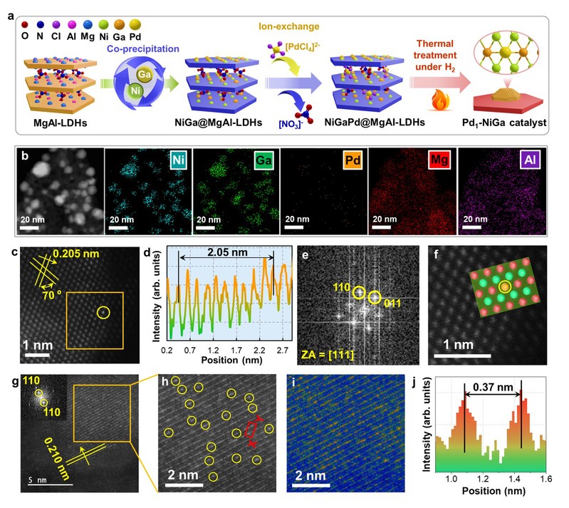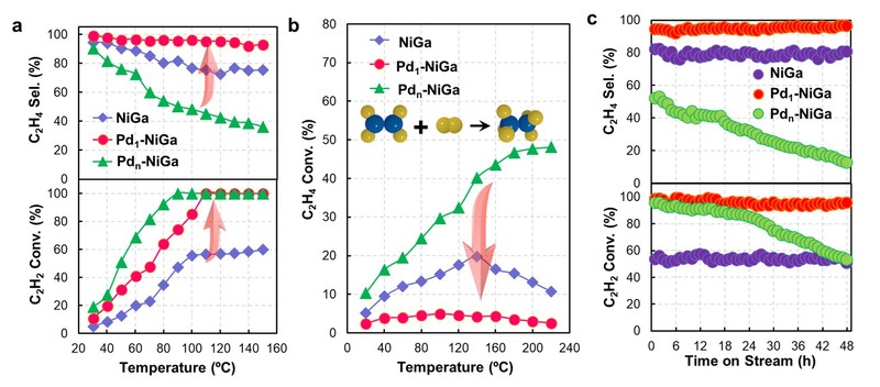 為此,研究團(tuán)隊(duì)針對具有完全隔離Ni位點(diǎn)的NiGa金屬間化合物催化劑,利用雙層金屬氫氧化物材料(LDHs)的層間陰離子可交換性和結(jié)構(gòu)拓?fù)滢D(zhuǎn)變特性,在NiGa金屬間化合物表面嵌入單原子Pd,并借助球差電鏡、X射線吸收光譜等結(jié)構(gòu)表征和理論計(jì)算對催化劑結(jié)構(gòu)進(jìn)行解析,證實(shí)Pd物種是以單原子的形式嵌入至NiGa金屬間化合物中原有Ga位點(diǎn)上,形成了具有Pd1Ni2Ga1集團(tuán)位點(diǎn)的Pd1-NiGa催化劑。結(jié)合吸附構(gòu)型解析、電子結(jié)構(gòu)分析、原位紅外光譜表征等機(jī)理研究手段,發(fā)現(xiàn)單原子Pd與Ga隔離的鄰近Ni位點(diǎn)協(xié)同作用,實(shí)現(xiàn)了其與表面關(guān)鍵物種的構(gòu)型匹配,促進(jìn)了反應(yīng)物炔烴的σ-吸附和氫氣的解離,同時促進(jìn)了目標(biāo)產(chǎn)物烯烴的脫附,預(yù)示其具有優(yōu)異的催化加氫性能。催化反應(yīng)性能評價(jià)進(jìn)一步表明,Pd1-NiGa催化劑在乙烯和丙烯選擇性超過96%時,乙炔和丙炔加氫活性均明顯高于目前已報(bào)道的炔烴加氫催化劑。可見,單原子Pd與鄰近Ni位點(diǎn)的協(xié)同作用在NiGa金屬間化合物上展現(xiàn)出“點(diǎn)石成金”(Midas touch)的效果,為進(jìn)一步設(shè)計(jì)高性能低碳炔烴加氫催化劑提供新的思路。