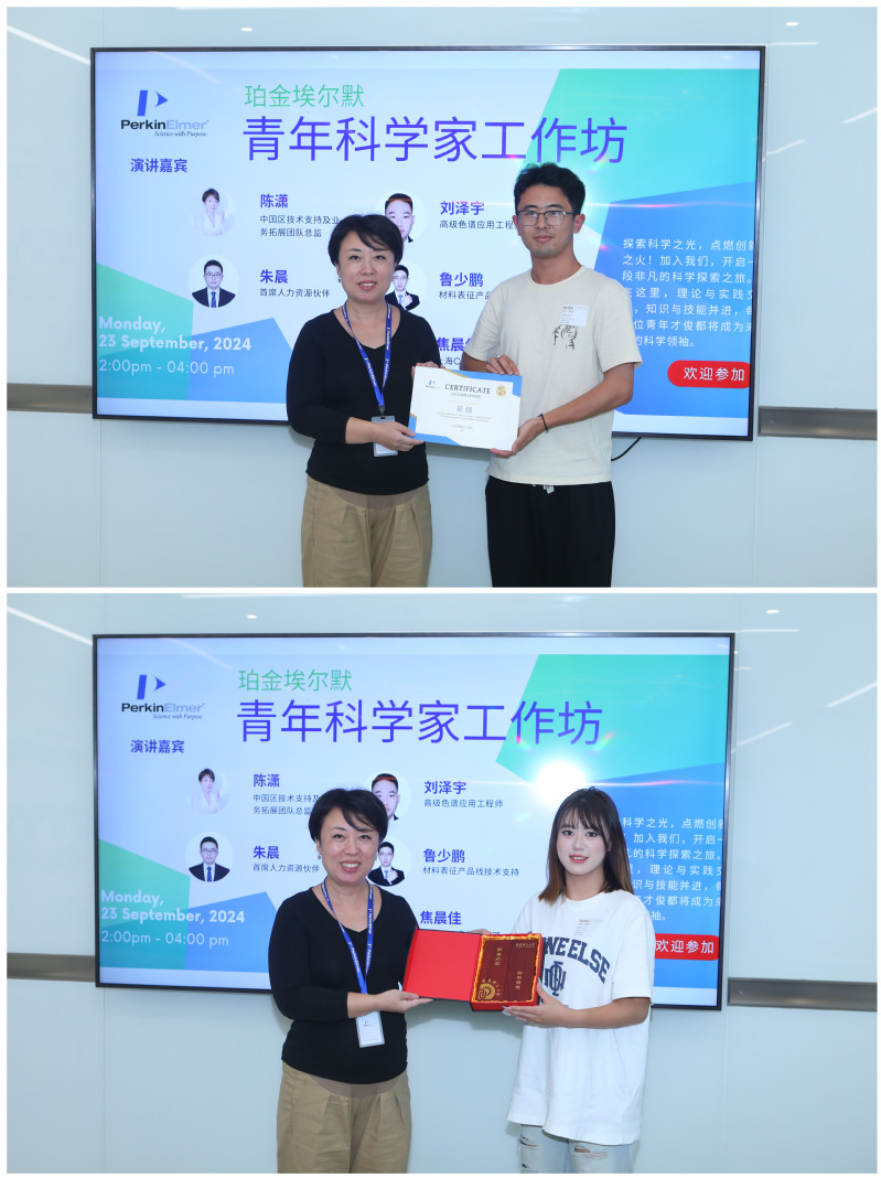活動(dòng)尾聲,陳瀟女士為參加活動(dòng)的同學(xué)頒發(fā)了證書,以表彰他們的積極參與;學(xué)生代表也為珀金埃爾默送上了精美紀(jì)念品,表達(dá)了對(duì)公司長(zhǎng)期支持教育事業(yè)、積極促進(jìn)科研發(fā)展的崇高敬意。