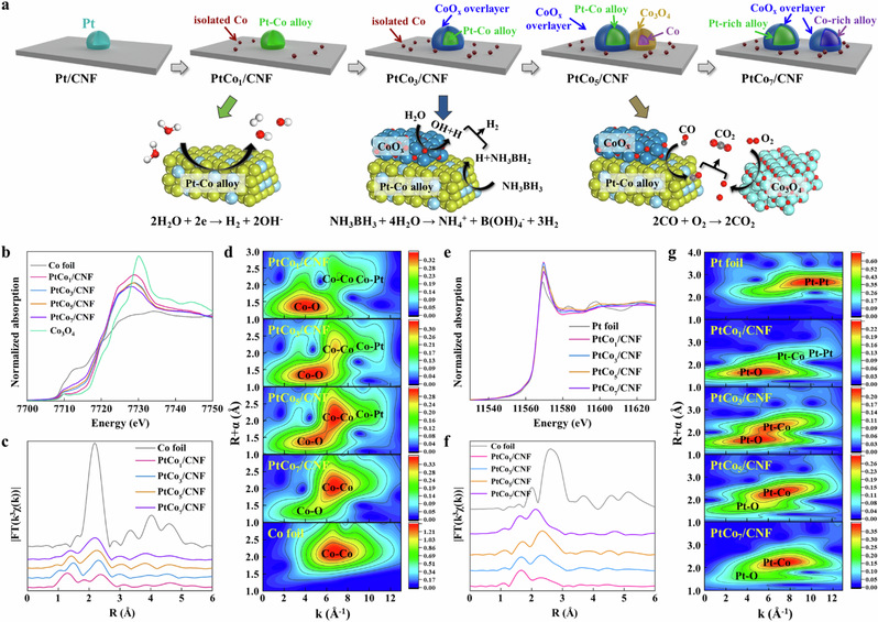 針對(duì)Pt-Co雙金屬催化劑,研究團(tuán)隊(duì)結(jié)合多重顯微和光譜表征、多尺度模擬、同位素標(biāo)記和穩(wěn)態(tài)同位素瞬態(tài)動(dòng)力學(xué)分析(SSITKA)等技術(shù),揭示了載體和吸附質(zhì)引起的顆粒結(jié)構(gòu)變化。發(fā)現(xiàn)在強(qiáng)Pt-C鍵(金屬-載體界面)和Co-O鍵(金屬-吸附質(zhì)界面)的驅(qū)動(dòng)下,隨著Co在Pt催化劑中的摻雜,首先形成富含Pt的合金,并伴有孤立的Co物種;進(jìn)一步,Co偏析到Pt催化劑表面,形成外延的CoOx氧化層和鄰近的Co3O4簇;最終顆粒結(jié)構(gòu)坍塌為無定形的合金。