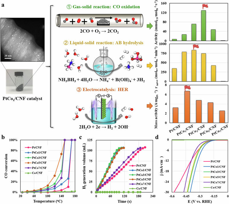通過進(jìn)一步探究活性位點(diǎn)穩(wěn)定性和相關(guān)反應(yīng)機(jī)理,揭示了不同界面位點(diǎn)間的協(xié)同作用,辨識(shí)了不同反應(yīng)的主控活性位點(diǎn):在CO氧化過程中,Pt-Co合金與相鄰的Co3O4團(tuán)簇不僅能降低Pt電子密度以弱化CO的吸附,還能提供豐富的晶格氧物種。在氨硼烷水解過程中,Pt-Co合金和外延CoOx覆蓋層分別作為氨硼烷和水活化的活性位點(diǎn),顯著促進(jìn)了氫氣的生成。在HER反應(yīng)過程中,Pt-Co合金可以避免外延CoOx或相鄰Co3O4簇的空間位阻效應(yīng),其顆粒內(nèi)的d軌道雜化可顯著降低Pt的d帶中心。這些協(xié)同效應(yīng)的發(fā)現(xiàn)和主控活性位點(diǎn)催化性能的量化,為構(gòu)建與傳統(tǒng)的組分/尺寸依賴火山曲線不同的協(xié)同效應(yīng)依賴火山曲線提供了可能,從而架起雙金屬催化中理論模型和實(shí)驗(yàn)觀察之間的“橋梁”。