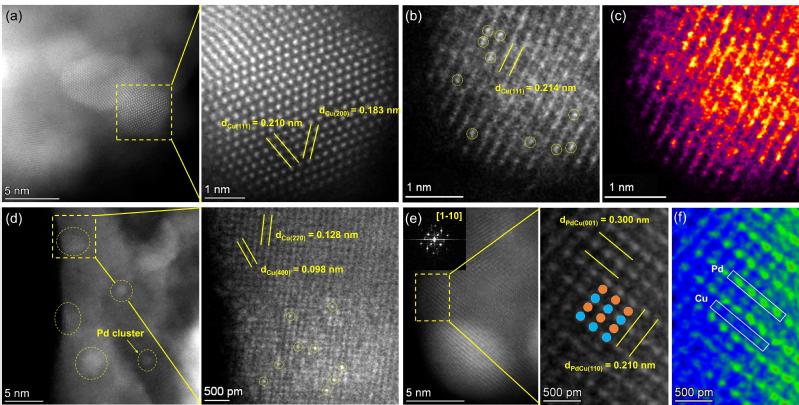 為此,研究團隊通過精確調(diào)控Pd/Cu比例,成功構(gòu)筑了Pd單原子修飾的Cu表面、Pd團簇位點修飾的Cu表面以及PdCu合金等不同局域環(huán)境的活性位點。催化性能測試、動力學(xué)分析和程序升溫實驗表明:Pd團簇位點的存在可直接催化原本發(fā)生在Cu位點上的丙炔加氫反應(yīng),同時促進氫氣解離活化和目標產(chǎn)物丙烯脫附,催化劑在丙炔完全轉(zhuǎn)化時丙烯的選擇性高達95.3%。相比之下,經(jīng)Pd單原子位點調(diào)變的Cu表面(與原始Cu催化劑的本征Cu位點相似)更易發(fā)生偶聯(lián)副反應(yīng),而PdCu合金催化劑上由于丙烯的強吸附而易發(fā)生過度加氫反應(yīng)。這些結(jié)果表明,本文構(gòu)建的雙金屬協(xié)同催化體系,通過利用Pd和Cu位點各自優(yōu)勢,在提升加氫活性的同時可有效抑制深度加氫與偶聯(lián)副反應(yīng)的發(fā)生。論文研究工作為通過催化劑活性位點局域環(huán)境精準調(diào)控關(guān)鍵物種吸附構(gòu)型和炔烴加氫反應(yīng)路徑提供新的思路,也為多相加氫催化劑理性設(shè)計提供借鑒。