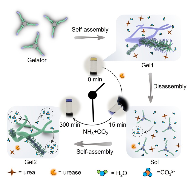 我校研究人員提出將酶促反應(yīng)與Hofmeister效應(yīng)相耦合的思想,成功構(gòu)筑出能夠動態(tài)感知Hofmeister離子序列的智能超分子水凝膠,模擬生命體對微環(huán)境變化的自適應(yīng)感知行為。團隊設(shè)計的凝膠因子含有羧酸基團,其自組裝行為可被尿素水解生成的親液離子NH??、CO?2?(Kosmotropic ions)精確調(diào)控。在脲酶催化下,尿素水解產(chǎn)生的堿性NH?和親液離子誘導(dǎo)凝膠經(jīng)歷從Gel1到溶膠Sol再到Gel2的自主轉(zhuǎn)變,實現(xiàn)對離子信號的實時感知與力學狀態(tài)的動態(tài)演變,將化學信號有效轉(zhuǎn)化為宏觀物性變化,為多模態(tài)輸出和智能反饋奠定了基礎(chǔ)。