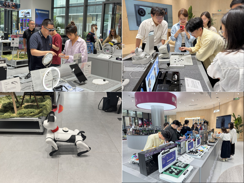 活動(dòng)首站,師生黨員走進(jìn)中國(guó)首個(gè)大模型創(chuàng)新生態(tài)社區(qū)——模速空間。在人工智能產(chǎn)品展廳,黨員們推動(dòng)自動(dòng)跟隨的智能行李箱,感受物聯(lián)網(wǎng)技術(shù)的便捷;彈奏智能無(wú)弦吉他、敲打空氣架子鼓,驚嘆于動(dòng)作捕捉技術(shù)的精準(zhǔn);佩戴實(shí)時(shí)翻譯眼鏡,體驗(yàn)即時(shí)翻譯的高效;與形態(tài)逼真的智能小狗互動(dòng),領(lǐng)略人工智能在生活場(chǎng)景中的創(chuàng)新應(yīng)用。這些沉浸式體驗(yàn)讓師生們直觀感受到人工智能的無(wú)限潛力,也為化工領(lǐng)域智能化發(fā)展帶來(lái)新思考。